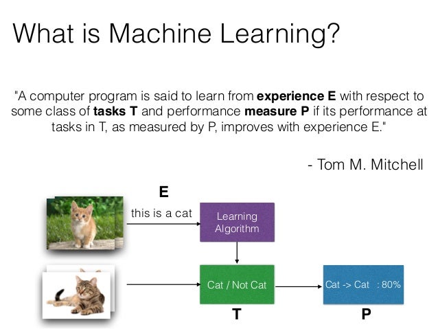 A computer program is said to learn from experience e with respect to some class for task t and performance measure p if its performance at task t as measured by p improves with. According to tom mitchel 1998 a computer program is said to learn from experience e with respect to some task t and some performance measure p if its performance on t as measured by p improves with experience e. A computer program is said to learn from experience e with respect to some class of tasks t and performance measure p if its performance at tasks in t as measured by p improves with experience e mitchell 1997 p.