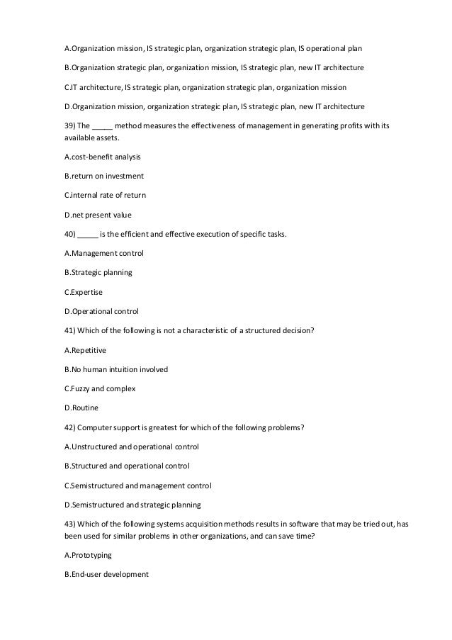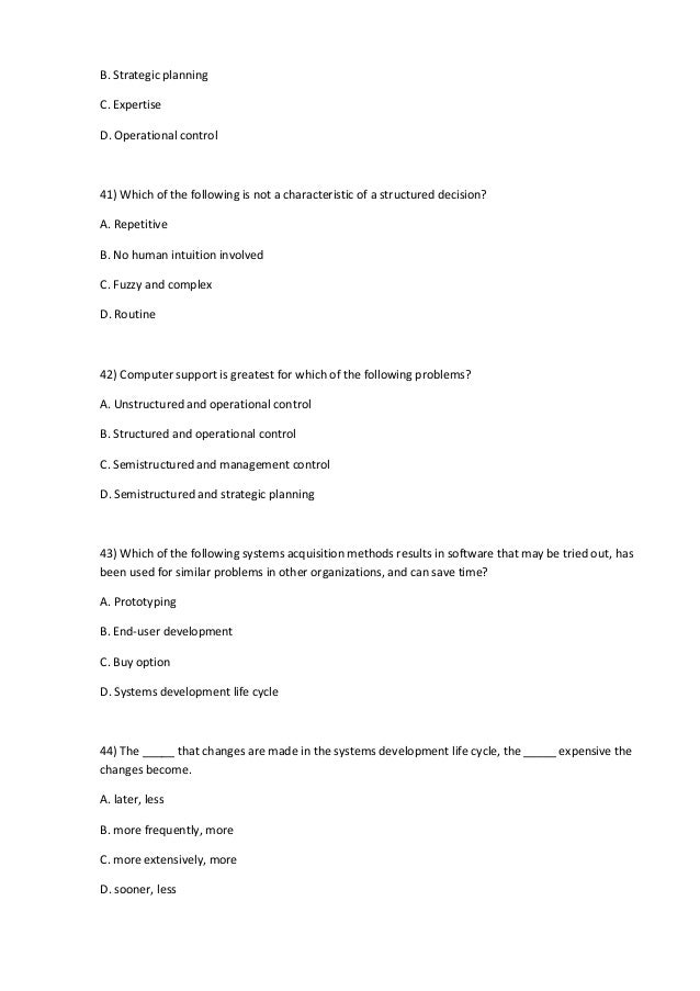 A semistructured and strategic planning b unstructured and operational control c structured and operational control d semistructured and management control e structured and management control answer. 60 computer support is greatest for which of the following problems. Lo 121 identify the phases in the decision making process and.