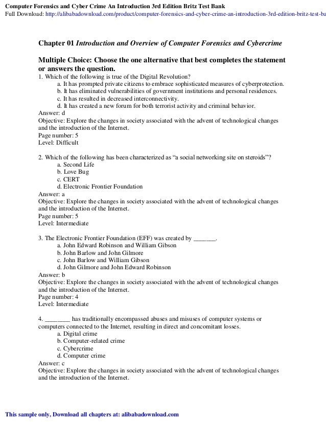 Computer forensics and cyber crime 2e provides a comprehensive analysis of current case law constitutional challenges and government legislation. Computer forensics and cyber crime an introduction 3rd edition britz test bank 1.